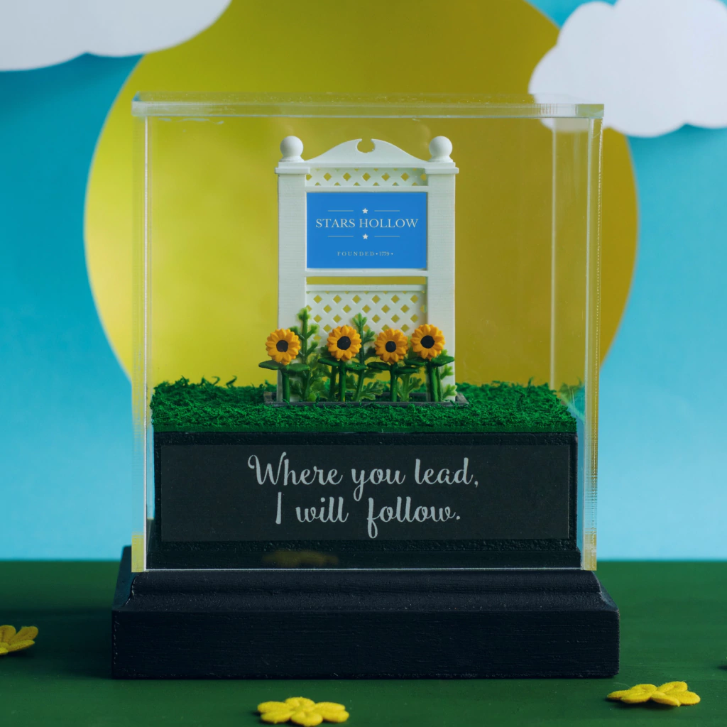 Essa miniatura da placa de Stars Hollow traz a essência da cidade encantadora de Gilmore Girls. A base da miniatura traz a frase "Where you lead, I will follow", que é um trechinho da música tema da série. Perfeita para decorar sua casa com um toque de charme e nostalgia ou para presentear alguém especial que também é fã da série. A peça vem acompanhada de um cubo acrílico removível, ideal para proteger sua miniatura e mantê-la segura.