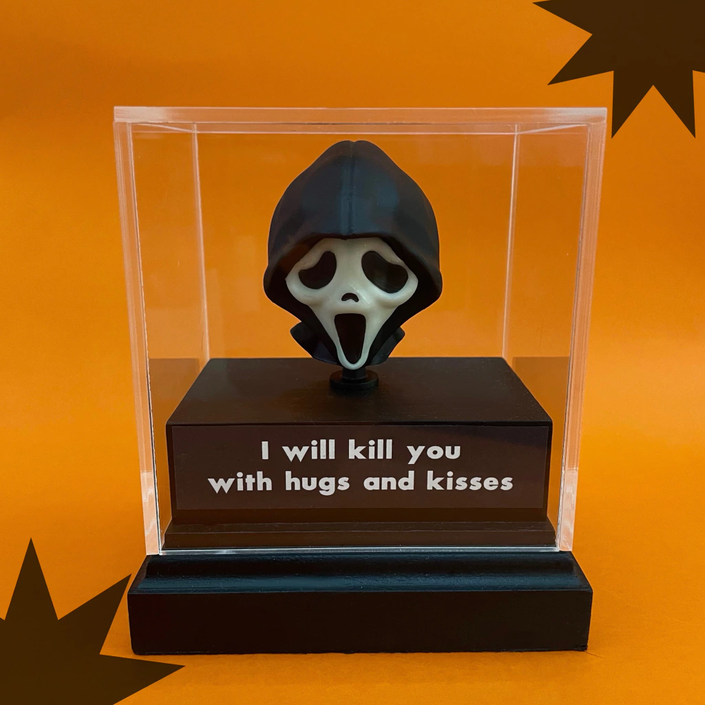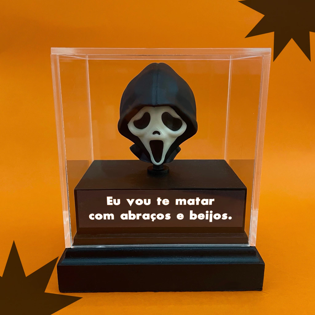 Esta miniatura traz a famosa máscara do Ghostface de Pânico, acompanhada de duas opções de frases que vão deixar qualquer fã da franquia em clima de suspense e diversão. Você pode escolher a icônica pergunta "Qual é o seu filme de terror favorito?" ou, para algo mais ousado e engraçado, a cantada "Vou te matar com abraços e beijos". A peça vem acompanhada de um cubo acrílico removível, ideal para proteger sua miniatura e mantê-la segura.