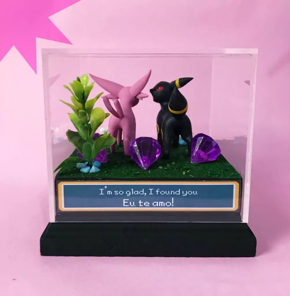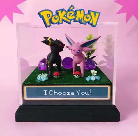 Embora no mundo Pokémon Umbreon e Espeon não sejam um casal, essa miniatura une os dois de uma maneira especial, com a frase "I Choose You" na base e "I’m so glad, I Found You" atrás. Perfeita para casais que sabem que, no final das contas, todo Pokémon encontra seu par – e quem melhor para representar isso do que esses dois, com suas energias complementares? Ideal para um presente romântico e único, cheio de charme e um toque nerd! A peça vem acompanhada de um cubo acrílico removível, ideal para proteger sua miniatura e mantê-la segura.