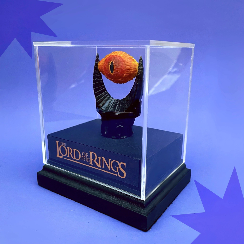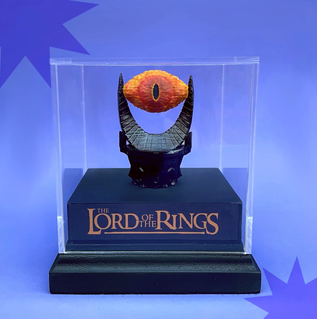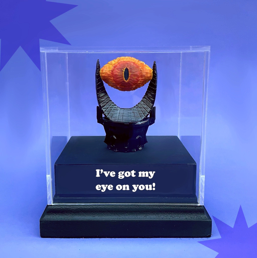 Esta miniatura traz o temido Olho de Sauron, com sua presença imponente que captura toda a essência de O Senhor dos Anéis. Na base, você pode escolher entre o logo da série ou a frase "I've got my eye on you" – uma cantada perfeita para aquele momento especial. Ideal para fãs de Tolkien que querem uma peça cheia de poder e mistério em sua coleção, ou para dar aquela mensagem "atenta" de forma divertida e única. A peça vem acompanhada de um cubo acrílico removível, ideal para proteger sua miniatura e mantê-la segura.